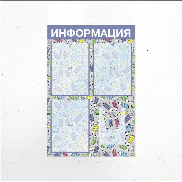 Карманы расположены вертикально, закреплены профессиональным вспененным скотчем 3M. Стенд предназначен для использования внутри помещения. Надпись нанесена методом УФ-печати. Возможно нанесение надписи и изображения по индивидуальному запросу.
